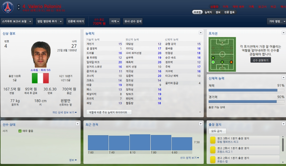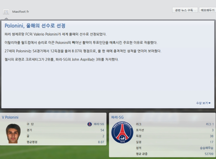 파리셍제르망의 Polonini 선수가 차지했습니다.