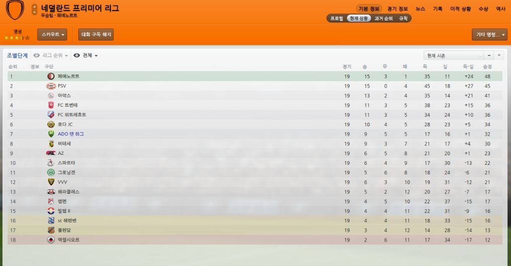 네덜란드리그에선 페예노르트가 1위를 달리고 있습니다.