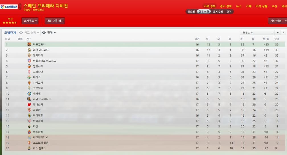 스페인리그에선 바르셀로나가 1위를 달리고 있습니다.