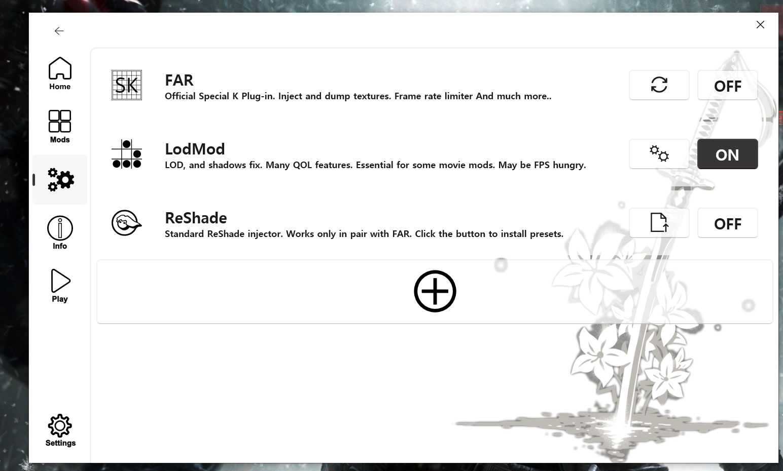 별거없어요 FAR(현 Special K)와 ReShade는 앞서 설치했기에 절대 건드리지마시고 LodMod는 컷씬 업스케일링 모드 까실때 필요할텐데 까실꺼면 설치하시고 아니면 설치안하셔도됩니다