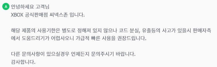 저도 11월딜 구매자인데 그 때 구매했던 코드는 판매자가 기한 없다고 했었어요. | 22.02.02 10:51 | | |