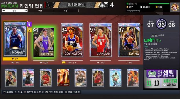 제가 kevin hueter 진화를시켰거든요? 라인업에서는 초록불로 뜨는데.. 3점슛 넣고 이겼는데