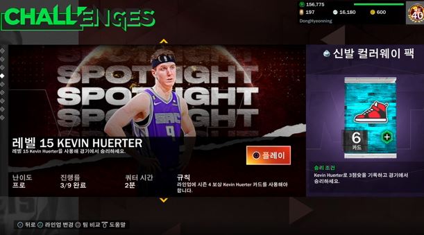 시즌4 보상 스포트라이트 kevin huerter 이 선수로 3점슛 넣고 승리하기 미션있는데..