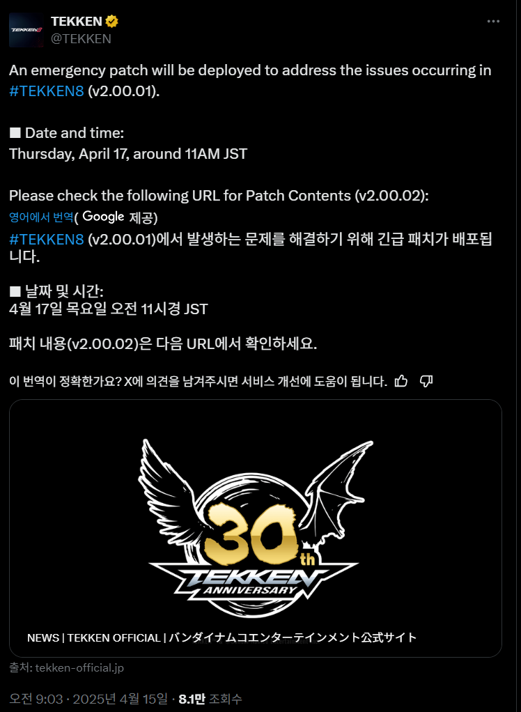 Tekken 8에 대한 지속적인 지원에 감사드립니다.