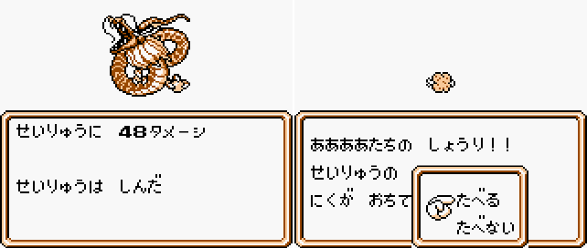 전투후 어쩌다 고기를 떨어뜨리는 경우가 있는데, 그냥 일반몹으로 변할 뿐이라 큰 기대는 하지 말아야...