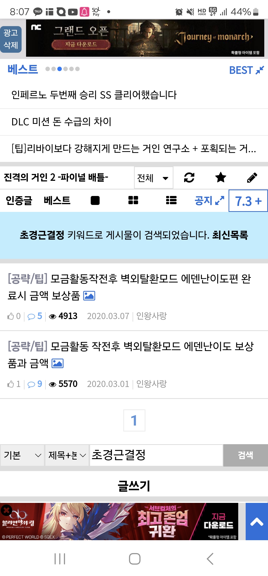 하단 제목+본문누르고 초경근결정 검색하면 글이뜨고 선택후 글에들어가면 있습니다