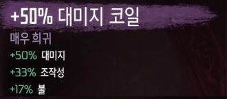 1. 말씀그대로 오염코일을 제외한 냉동 감전코일 첫번째 옵션이 붙은 코일류는 2번째줄코일옵션 이나 3번째줄코일옵션에는 조작성옵션자채가 뜨질 않습니다. 안나오는 일반 코일 냉동50/조작성33 이나 감전50/조작성33 X 나오는 일반 코일 오염50/조작성33 O 2. dlc전용 코일이 1개씩 지급되기때문에 여러회차를 도셔야되는데 dlc까지 계승하려면 세이브 로드아웃을 해야됩니다. 문제는 로드아웃 조건이 메인퀘스트 엔딩을 회차당 꼭 해야 해금되는 방식입니다. 즉 다회차하실때마다 메인퀘스트엔딩을 보시고 로드아웃을 해금하고난뒤 dlc 코일을 모으신뒤 세이브 로드아웃 후 회차반복으로 하시면됩니다. 3.스샷을 참고하세요 4. 15%가 최대치입니다.