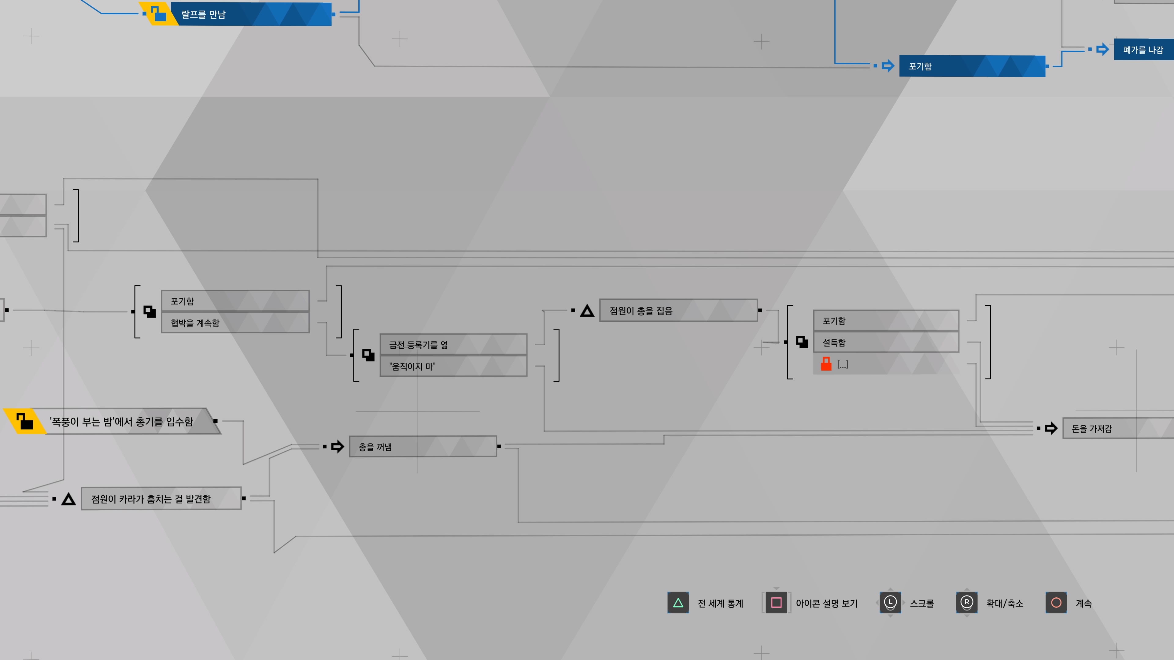 1. 편의점 점원과 서로 총을 겨눌 때 순서도 상에는 선택지가 3개이지만, 가능한 진행방법은 2가지 밖에 없습니다.