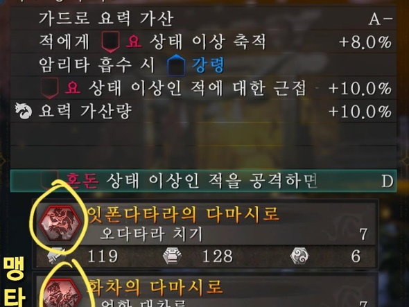 이걸 해두고 혹시 인벤에 고다마의 밥그릇 투구가 있다면 이것까지 쓰시면 고다마 가호의 효과가 증폭되어 더 좋습니다.