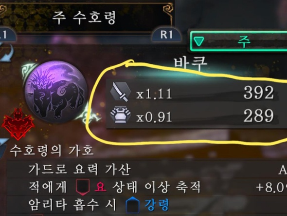 초반에는 대부분 위 사진과 같이 "아귀도로 인도" 를 붙여서 사용하는데, 이것은 "암리타 흡수시 체력회복 50" 효과를 가집니다.