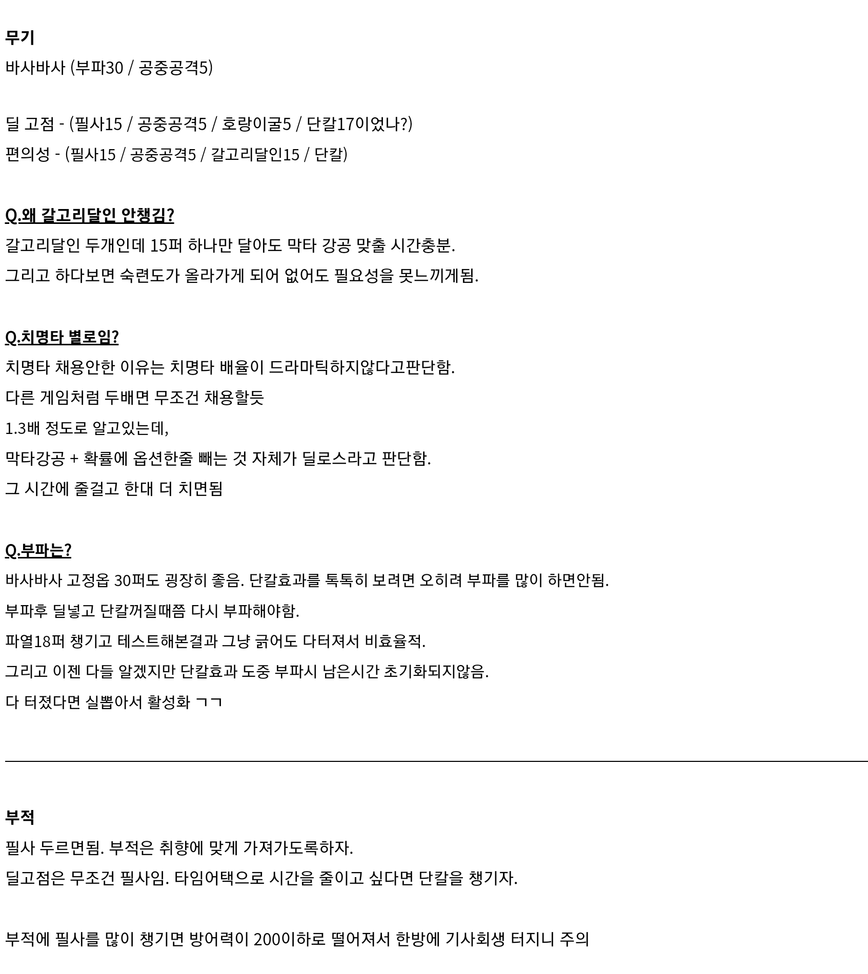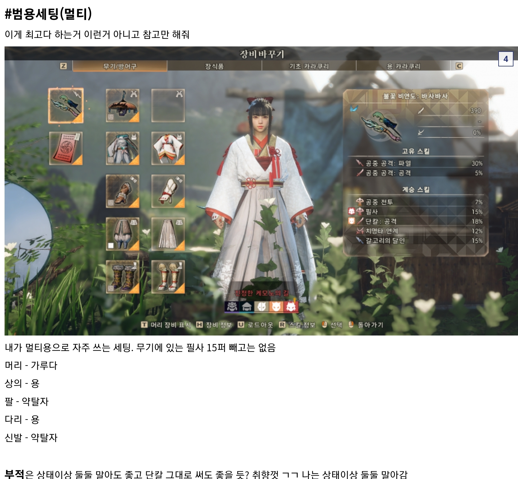 이번 신장비와 방어구에서는 전 필사를 안쓰기 때문에 상의는 물불늑대 방어구 입고 있어요 그리고 신무기는 카타나가 젤 낫다는것 같습니다 그래서 무기는 그냥 | 23.03.27 10:22 | | |