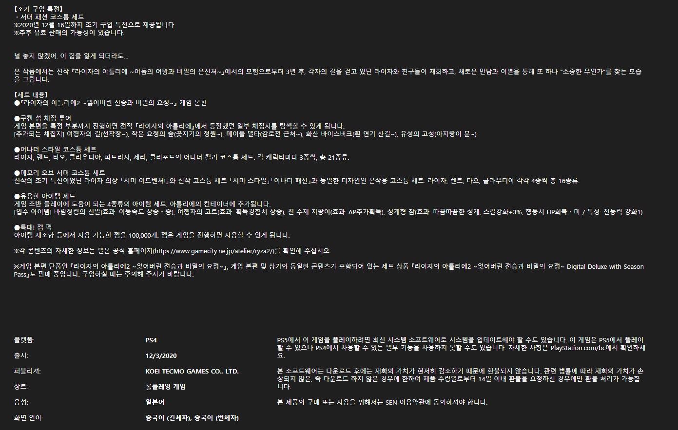 반면에 아틀리에는 그냥 PS4만 기재되어 있었고요. 물론 유통사가 다르니까 이 부분은 조금 다를수도 있긴한데... 아침에 프슨에 올라오지 않는다면 디지털터치든, 코에이든, 거스트든 엄청 욕먹을듯 싶네요. | 20.12.03 02:50 | | |