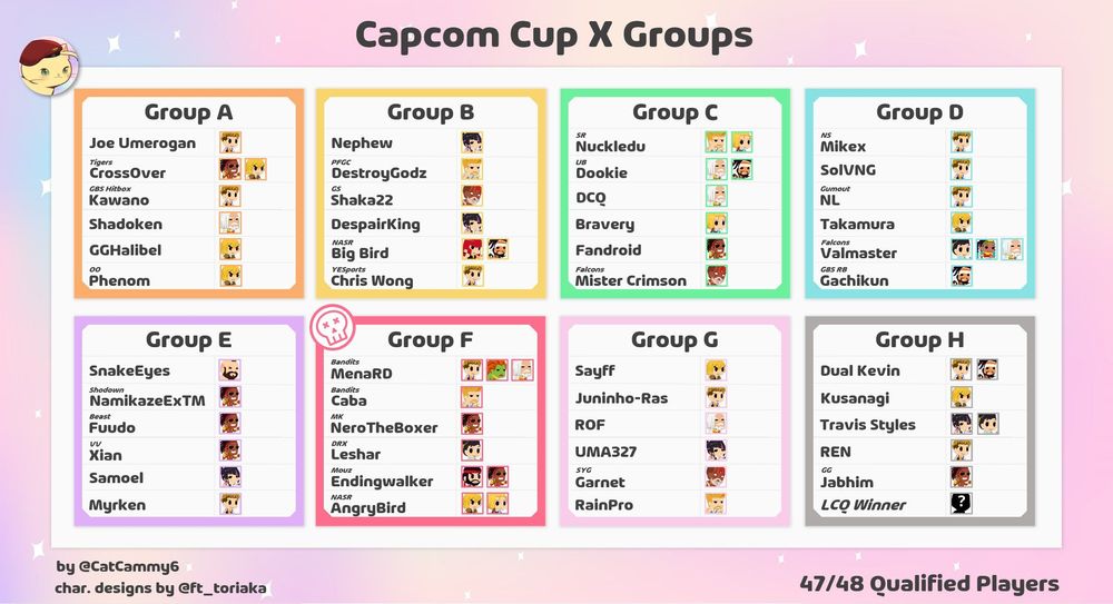 Last Chance Qualifier — Results 1. Mouz|Problem X (Blanka) 2. FLY|Punk (Cammy, Luke) 3. Chat|JB (Rashid) 4. Ibushigin|Kakeru (JP) 5. DFM|John Takeuchi (Rashid) 5. Rohto|Tokido (Ken) 7. SBI|Hibiki (Lily) 7. Zhen (Dee Jay) 9. Julio Fuentes (JP) 9. iXA|Acqua (JP) 9. SNB|Yamaguchi (Dee Jay) 9. GyoGun|Moke (Chun-Li) 13. NoahTheProdigy (Luke) 13. Vxbao (JP) 13. SML|Randumb (Manon) 13. Saishunkan|Nemo (JP) 17. Kusanagi (Luke) 17. FAV|Sako (Chun-Li) 17. AZ|MOV (Chun-Li) 17. BST|Daigo (Ken) 17. TM|OilKing (Rashid) 17. Gank|Seo (JP) 17. GyoGun|Mizuha (Cammy) 17. RB|Bonchan (Luke) 25. Alex Myers (Chun-Li) 25. Flaquito (Jamie) 25. Samurai (Luke) 25. Shiraishi (JP) 25. Zaferino (Dhalsim) 25. FAV|Ryuusei (JP) 25. Wolfgang (Blanka) 25. 00|Veggey (Zangief) 33. MK|Darlan (Ken) 33. LordVenom (JP) 33. Charlie (JP) 33. Sleepnsheep (Zangief) 33. AA|Roxas32 (Luke) 33. VGY|Pulgaa (Luke) 33. YaNoob (A.K.I.) 33. Alex Smith (Juri) 33. Sami (Cammy) 33. HB|Docta Afrikan E.X. (JP) 33. GyoGun|Mago (Juri) 33. AlfieRoach (Juri) 33. UltraViolet (Rashid) 33. Reynald (JP) 33. DouyuTV|Xiao Hai (Ken) 33. Saishunkan|Higuchi (Guile) 49. Trix (Manon) 49. EnzoTheHokage (Ken) 49. EDLN|Ultimaleo (Cammy) 49. MJ Gama (JP) 49. FGMarathon (Luke, JP) 49. Paladin (Ryu) 49. LowTrunks (Juri) 49. Dreaddragon (A.K.I., Zangief) 49. JayceTheAce (Ken) 49. UCIT|NoRespect (Marisa) 49. CODEXgameing (JP) 49. Rikemansbarnet (Juri) 49. AA|GamerBee (Luke) 49. A | 24.02.19 15:12 | | |