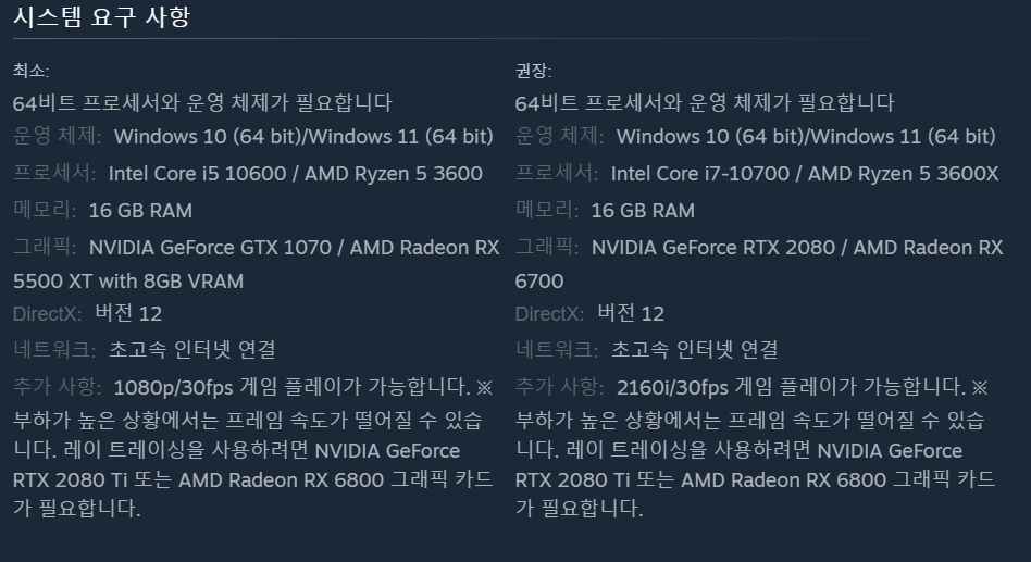 현재 스팀에 나와있는 pc사양입니다 레이트레이싱은 2080ti이상이여서 플스가 좋으실거같아요 레이트레이싱이 콘솔은 엑시엑 및 플스5 적용예정이라 엑시스는 아니구요 | 24.03.07 11:54 | | |