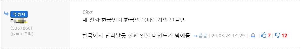 나도 저런 게임 굳이 욕먹을 바엔 안한다는 주의고 살생각도 없는 사람이고 욕처먹어가면서 한다고 인증하는 놈들도 곱게 안보는데 진심 친일파인 ㅇㅅㅇ처럼 개소리 씨부린거도 아니고 게임 하나 한거 가지고 사람 함부로 매국노쓰레기로 매도하는데 아이디가 일본캐릭인 너같은 새끼들 존나 개역하거든 ㅋㅋ 리뷰어는 논란있는 게임 리뷰하면 안됨? 그러라고 있는 사람들 아님? 디렉터 이슈와는 별개로 게임성은 어떤지 궁금해하는 사람들한테 랜선 키보드 애국질하는 너랑 달리 정보는 제공해주잖음?ㅋㅋ | 24.04.03 22:05 | | |