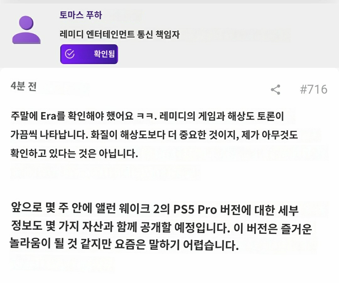 - Remedy Entertainment의 Thomas Puha가 'Alan Wake 2'의 PS5 Pro 버전에 대해 언급했다. 그는 해상도보다 이미지 품질이 더 중요하다고 강조했으며, PS5 Pro 버전에 대한 자세한 정보를 곧 공개할 예정이라고 밝혔다.