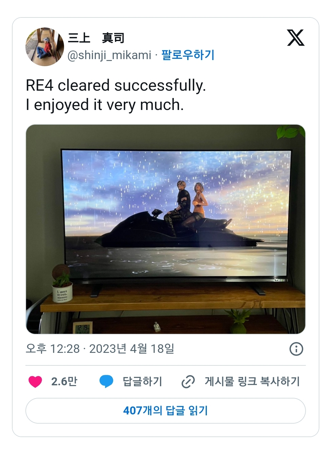 감정은 상대적인 것이니 과거보다는 현재의 감정이 중요하지 않을까요?? 어찌되었든 캠콤 입장에서는 게임 흥보하려면 미카미의 호평도 중요하니 화해하고 잘 지내고 있을 수 도 있죠. 또 서로 잘지내고 있기 때문에 저런 인스타가 가능한겁니다. 인간관계하고 똑같아요. | 25.08.10 07:38 | | |