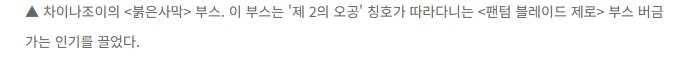 마지막 사진 설명: 차이나조이의 <붉은사막> 부스. 이 부스는 '제 2의 오공' 칭호가 따라다니는 <팬텀 블레이드 제로> 부스 버금가는 인기를 끌었다. 오공은 훌륭한 게임이다 - > 팬텀블레이드제로가 제2의 오공이랜다 -> 붉은사막 부스도 팬텀블레이드제로만큼 인기 끌었다 -> 고로 붉은사막 = 제2의 오공인 것이다 라는 기막힌 4단논법