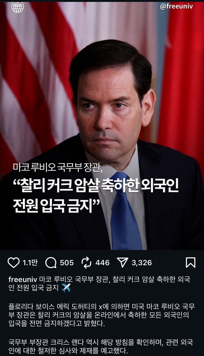 추모를 강요한적은 없음 조롱하는걸 뭐라 하는거지 이 사이트에서 조롱하는 아이디들 미 국무부에 신고는했는데 미국이나 동맹국들에 입국안되면 그런줄 아시길요 | 25.09.14 12:31 | | |