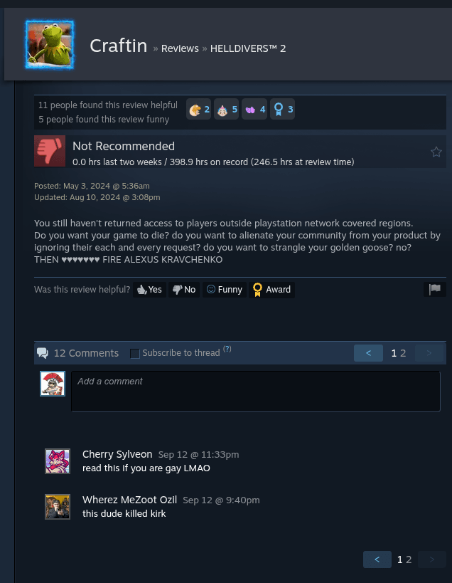 살인범 스팀 계정도 털렸는데 400시간이나 플레이하고 리뷰 남긴 기록이 있어서 서양쪽은 난리인듯..