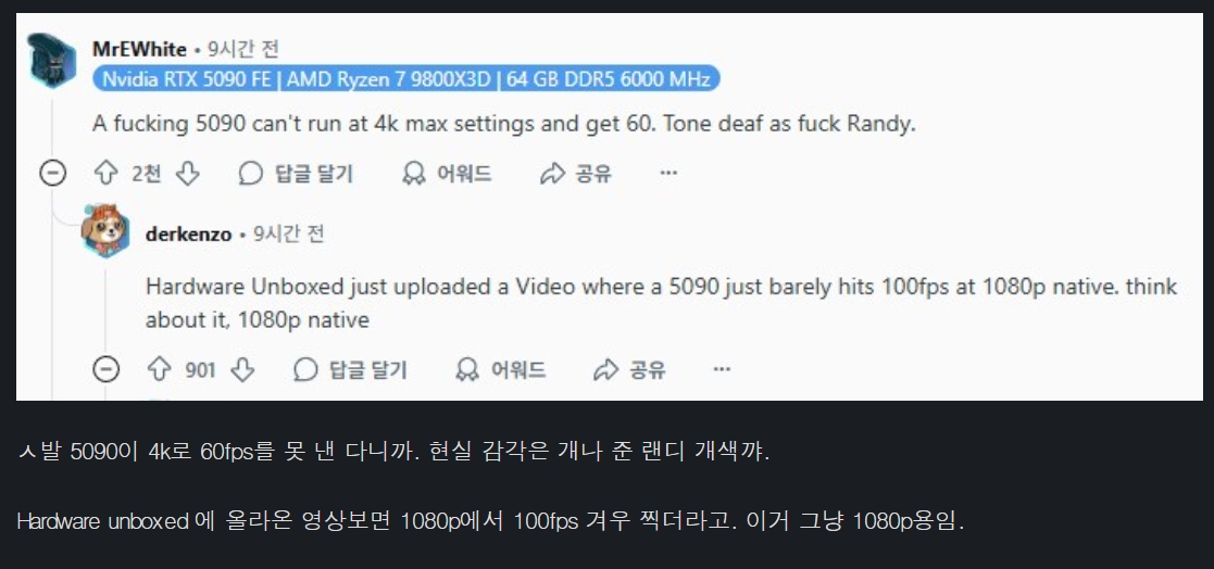 이건 걍 PC정보 같은데 가난해서 5090도 아닌것들이 4k를 고집해서 그렇다는 주장이니ㅋㅋ 엑박이나 플스처럼 최적화 되지않은 낡은 PC하드웨어로 하려하는게 문제라며 꼬우면 스팀 환불해라니 참 요즘 소비자 상대로 이런 개소리를 싸지르다니