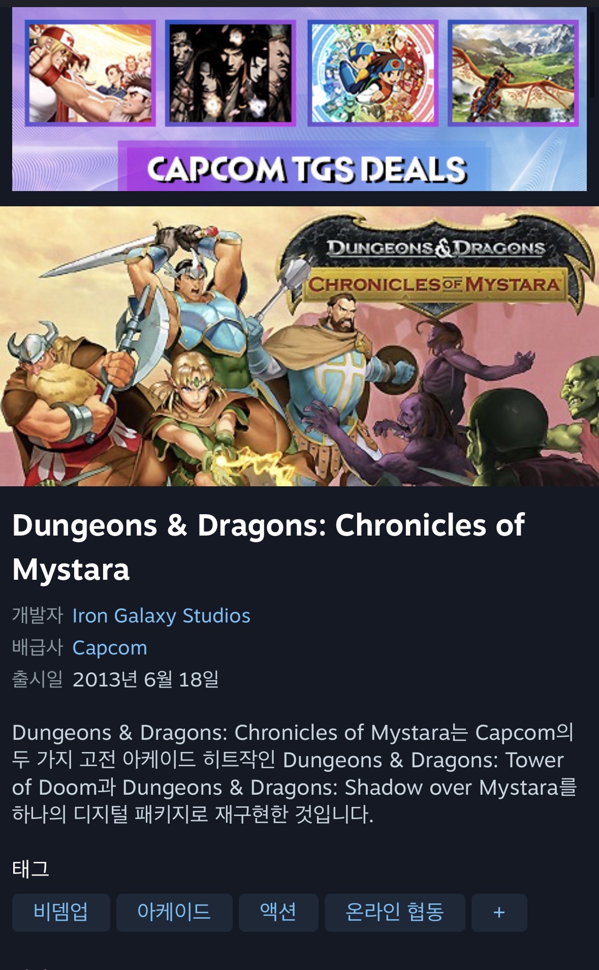 이거는 캡콤 이식이 아니라 별로고, 진퉁은 PS3로 나온, “일본판” 미스타라 연대기(D&D1, D&D2 합본)지요. 희안하게 “PS3용” “일본판”만 캡콤이 직접 이식을 해서 할만 합니다. | 25.09.16 15:55 | | |