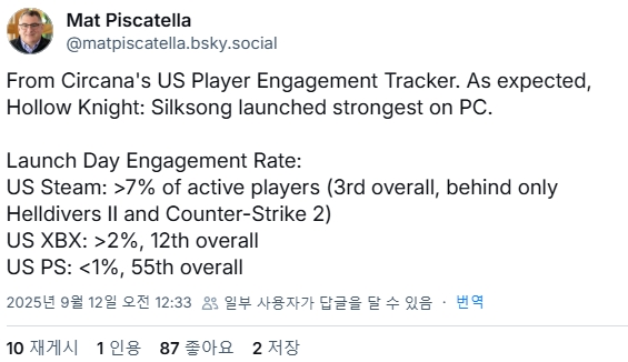 단순히 트레이너 때문에 7%나 더 많다는건 좀 무리수고, 그냥 할로우 나이트 시리즈 자체가 PC 버전이 압도적으로 많이 팔렸고 그만큼 시리즈에 열정적인 유저도 많아서 그런거 | 25.09.18 14:04 | | |