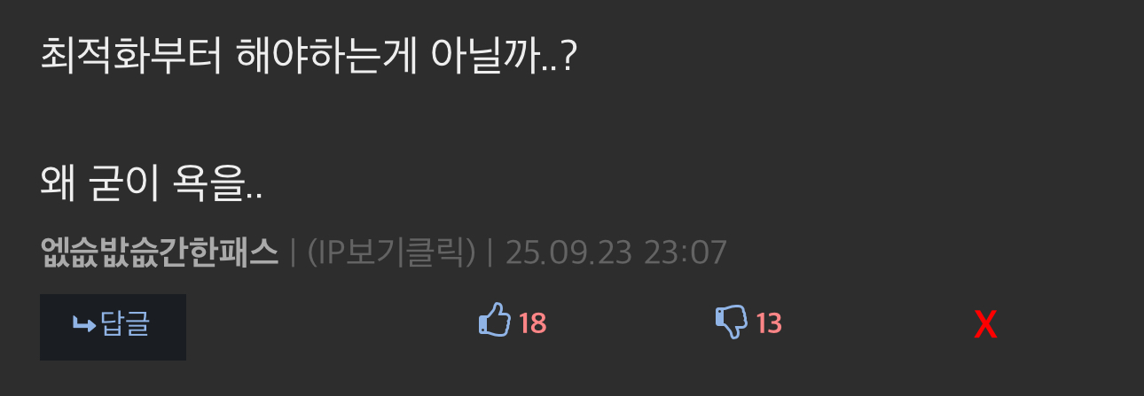 엥; 뭐죠? 저런글을 쓴적이없는데. 아이피 저거 버튼 까보세요. 몬헌쉴더니 그런거 없엇는데 다른사람글 착각하시면서 올리신거같은데 | 25.09.25 00:13 | | |