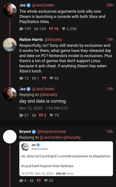 코든은 플랫폼 독점에 대한 토론에서 이 같은 선언을 했습니다. 그는 새로운 Steam Machine이 방대한 타이틀 라이브러리를 보유한 콘솔 게이머들을 유혹할 수 있다고 설명합니다. 이러한 게임 중 일부에는 Valve의 마켓플레이스에서 이미 판매 중인 Xbox 및 PS5 게임이 포함됩니다.