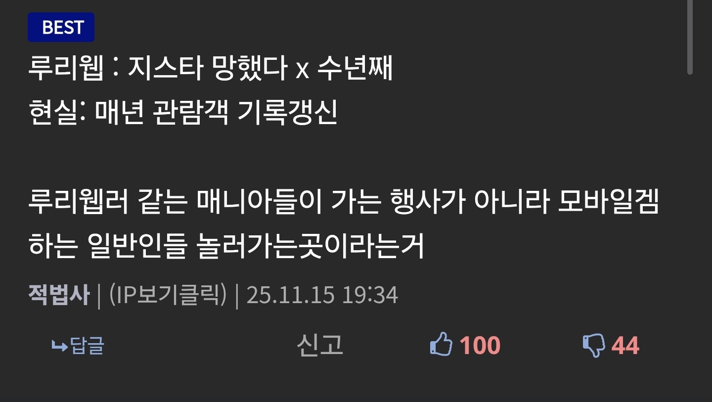 루리웹 : 지스타 망했다 x 수년째 현실: 매년 관람객 기록갱신 루리웹러 같는 매니아들이 가는 행사가 아니라 모바일겜 하는 일반인들 놀러가는곳이라는거