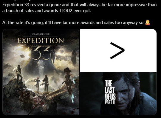 솔까 양키웹진들이 타게임들 까내리면서 올려치니까 반발심드는거임 해외에서도 33뭐 잘만든건 인정하는데 무슨 마치 뭐 게임계 역사를 바꿀만한 게임이다 ㅇㅈㄹ하면서 근들갑떠니까 거기서도 33에 대한 반발심이 꽤 존재함 | 25.11.18 16:00 | | |