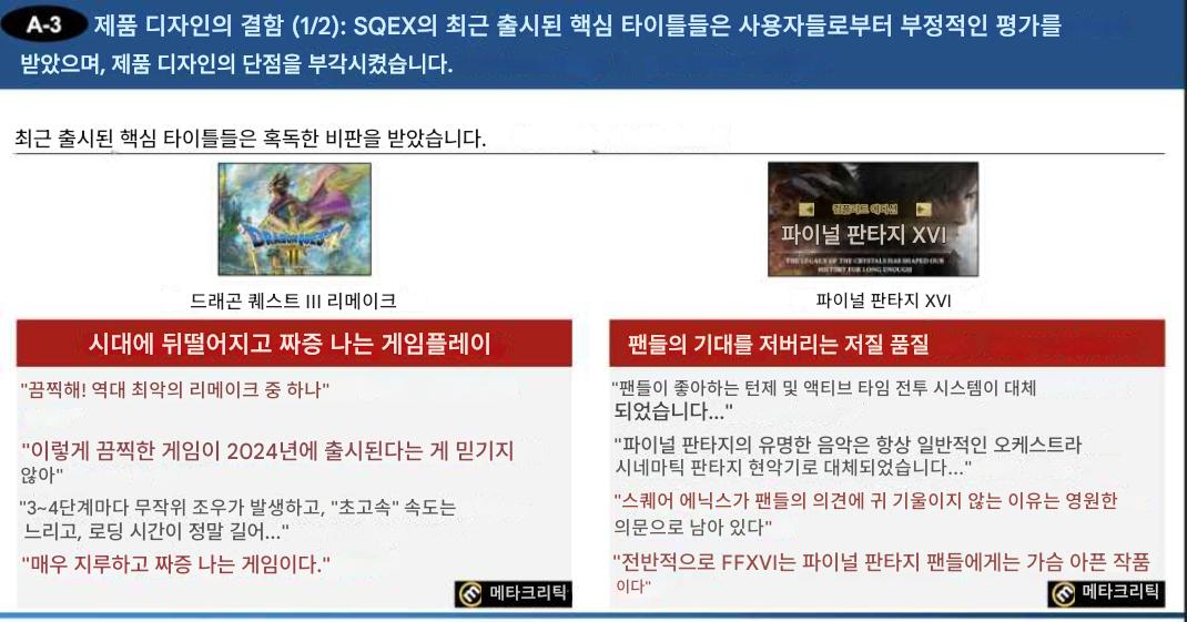 3D Investment Partners는 이러한 부진의 원인을 콘솔 및 모바일 게임 부문의 저조한 실적, 막대한 취소 게임 관련 비용 상각, 그리고 비핵심 사업(아케이드 및 출판)의 시너지 부족으로 꼽았습니다.이들은 스퀘어 에닉스가 제시한 2025년~2027년 중기 전략인 '리부트' 계획이 장기적인 회복 비전, 구체적인 실행 계획, 그리고 개선 마진 측면에서 불충분하다고 주장했습니다.