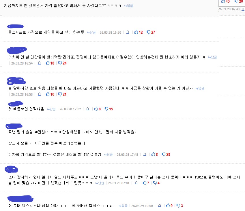 키보드워리어들 신나서 유저 욕하고 있네 지금 플스 가격 인상을 사람들이 왜 그냥 이해하는지 반도체쪽 조금이라도 보면 다 아는데 그간 죽어라 무시하면서 욕하고 빠들이 문제다!하면 그냥 플스가 싫은 거 아님? | 26.03.30 18:44 | | |