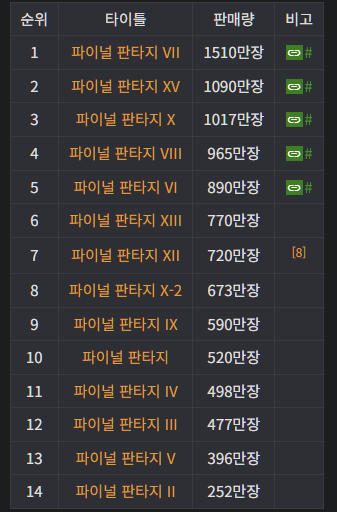 사람들이 파판 판매량에 대해 크게 착각 하는게 하나 있는데 개발비 올라서 순익 줄어든 건 맞지만 이건 현세대 AAA 겜이라면 공통의 문제인거고 파판 판매량 자체는 예전이랑 별 차이 없음 파판은 원래 초동 300만 → 꾸준히 500~600만 → 할인장기판매 8~900만 페이스임 원래부터가 천만을 기본으로 찍는 IP가 아님 실제로 천만 넘긴 넘버링은 단 3개, 그것도 수년~수십 년 걸려서 달성함 FF12가 플스2 버전 500만 팔고 십여년후 리마스터 추가로 700만 달성, 이게 딱 파판 평균임. FF7 원작도 리메이크 나오기 전까진 20년 넘게 1100만대에 머물러 있었고, 리메이크 나오면서 400만 더 팔린 거임. 즉 리메이크 판매 페이스가 원작보다 빠름 리메이크 700만은 2년 전 수치라 지금은 훨씬 더 팔렸을 거고 스위치 버전 + 3부 나오면 결국 천만은 넘길 거라 봄 속편 판매량이 떨어지는 건 이미 FF10/13 시리즈에서 겪은 일이고, 특히7 3부작은 원작 스토리가 이미 오픈되어 있을 뿐 아니라 각 편이 4년 간격으로 나오니 중도 이탈도 많고 신규 유입도 동시에 막혀버려서 어느 정도 예상된 흐름이었다고 봄 애초에 3부작이 무리수였긴함 아무튼 문제는 파트3 이후 높아진 개발비를 어떻게 처리하느냐에따라 달린건데 파판도 젤다처럼 외연확장 성공하든가 (의외로 야숨 이전 까진 단일 천만 하나도 없었음) 그게 안되면 개발비 줄이든가 아니면 시리즈를 접든가 할거임 뭐 그건 SE가 알아서 할 일이고.. 안그래도 AAA 가뭄인데 대형 게임 하나라도 더 나오면 좋은 거 아닌가? 왜케 망하라고 저주하는 사람들이 많은지 몰겠음 파판16은 일주일 300만 팔아도 망했다 다른 게임들은 한 달 300만이면 대성공 다들 하나만 했으면 좋겠다