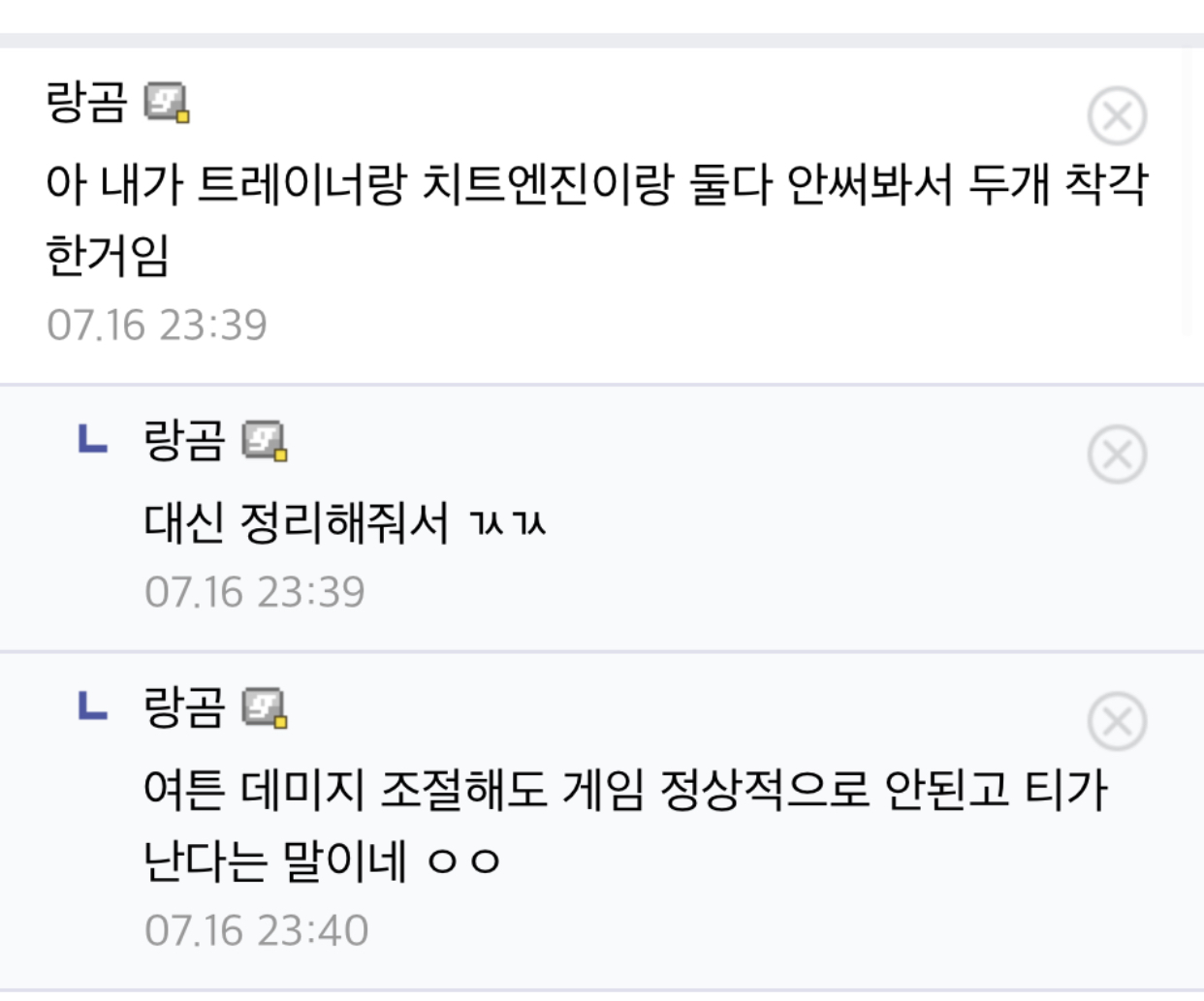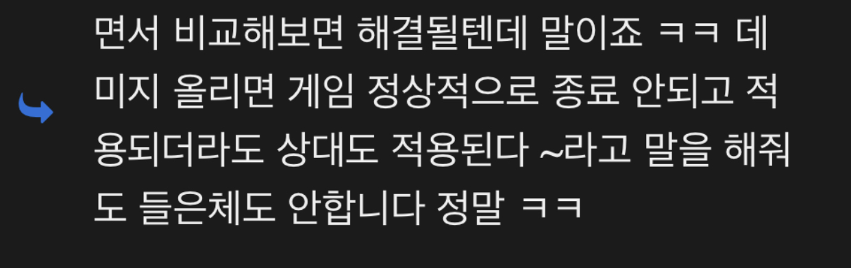트레이너 치트 둘다 모르신다는 분이 갑자기 전문가가 되셨네요 그리고? 데미지 올리면 정상적 종료도 안되며 상대도 적용된다고 말씀하셨네요? | 20.07.19 21:18 | |