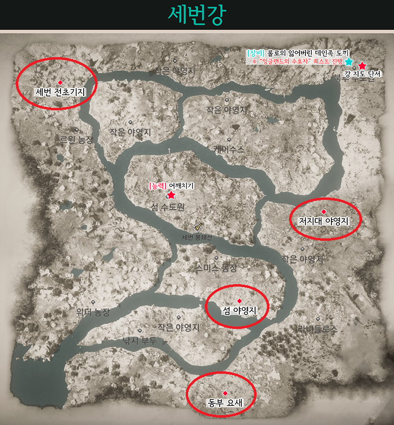 세번강은 세번전초기지 / 저지대야영지 /섬야영지 /동부요새 4군데중 2군데 랜덤으로 장비상자가 나온다고 합니다 하나 찾으셨으니 4군데중 한군데서 떠야 정상입니다 한번진입해서 4군데 모두 확인해보신거죠? 팔보호구가 여기서 나와야 하는군요 | 24.07.31 19:39 | |
