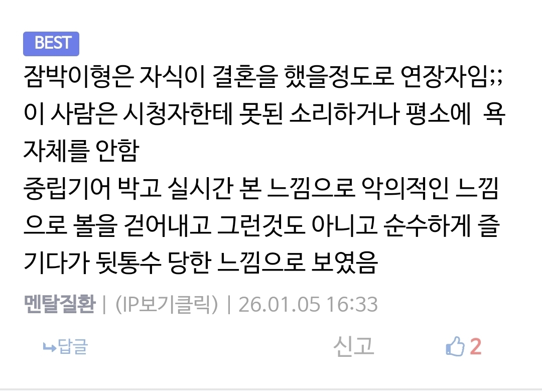이런분이 약간 그런축인거 같은데 ㅋ 방송 잠깐만 봐도 그냥 계속 욕하던데 ㅋㅋ난 진짜 나이가 그렇게 있는데 그따구로 욕하는 사람은 첨봄. 아니 자식이 결혼까지 했는데... 며느리가 혹시나 보면 어떨까 생각은 안해볼까 싶어요 진짜로 상대 가려가면서 까는 건 거기 기생하는 간신들임 | 26.01.28 12:49 | |