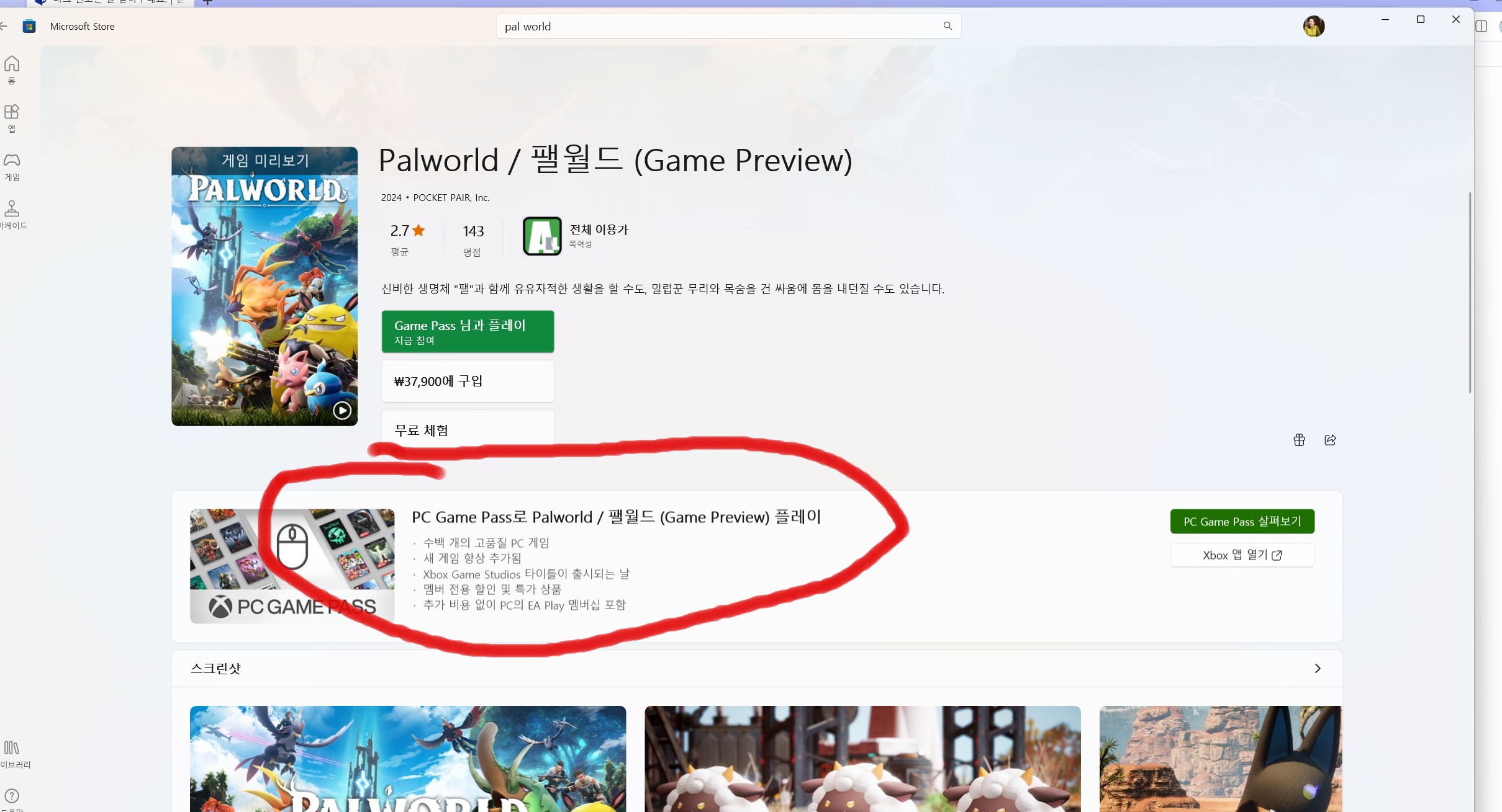 지금 캡쳐하신건 게임 구매 없이 게임패스 구독을 하면 팔월드 게임을 실행할수 있다는 이야기 입니다. 엑스박스 앱과 는 상관이 없습니다.. 저 죄송한데. 지금 마소스토어에서 팔월드 게임을 구매 또는 게임패스 구독하신 상태이신가요? 엑스박스 앱 삭제하고 팔월드 게임을 실행해 보세요. | 24.01.28 22:31 | | |