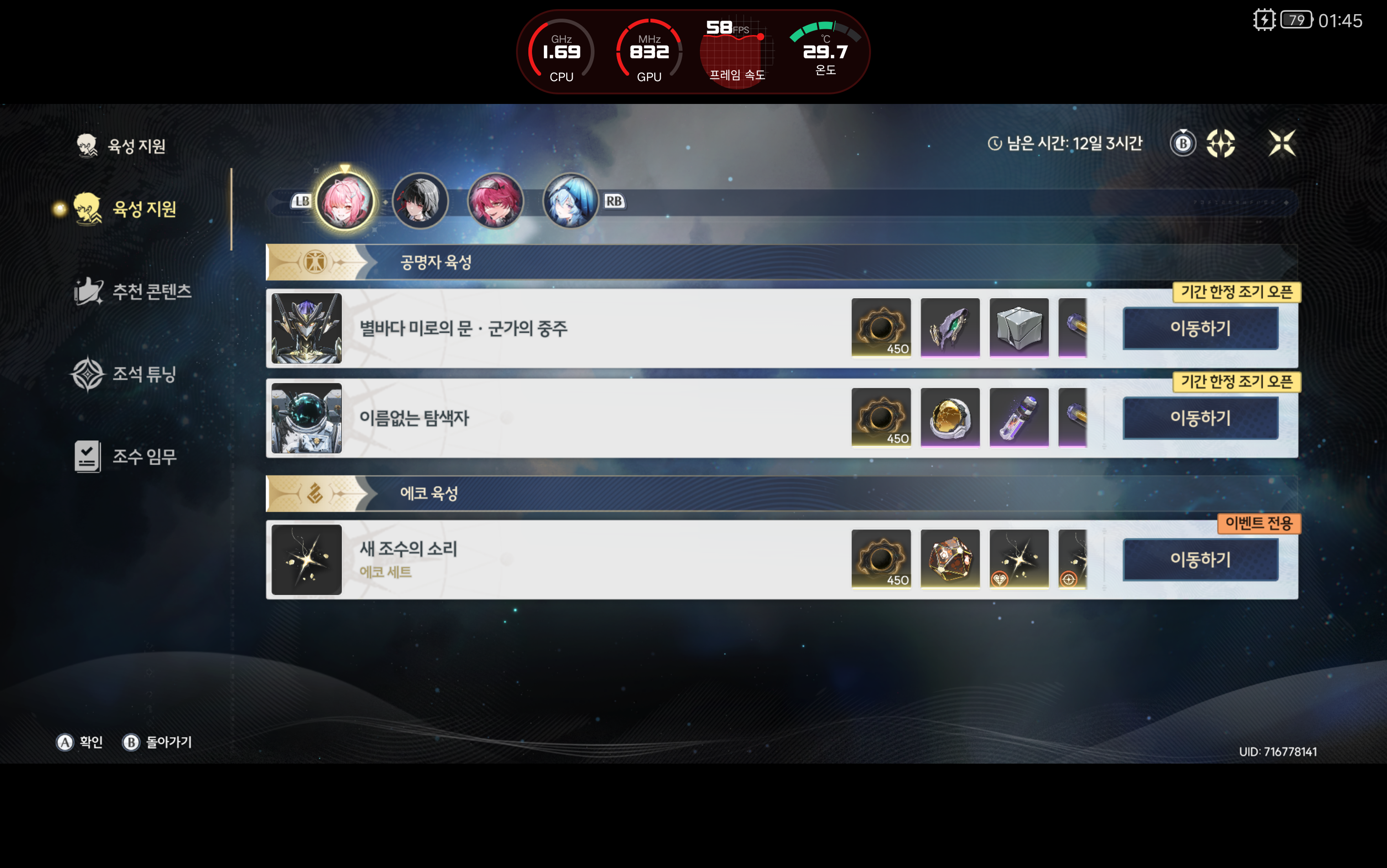 (현재 보유 : 방랑자(LV50), 설지(L40), 양양, 에이메스(LV40), 산화(LV1), 유호, 알토, 도기)