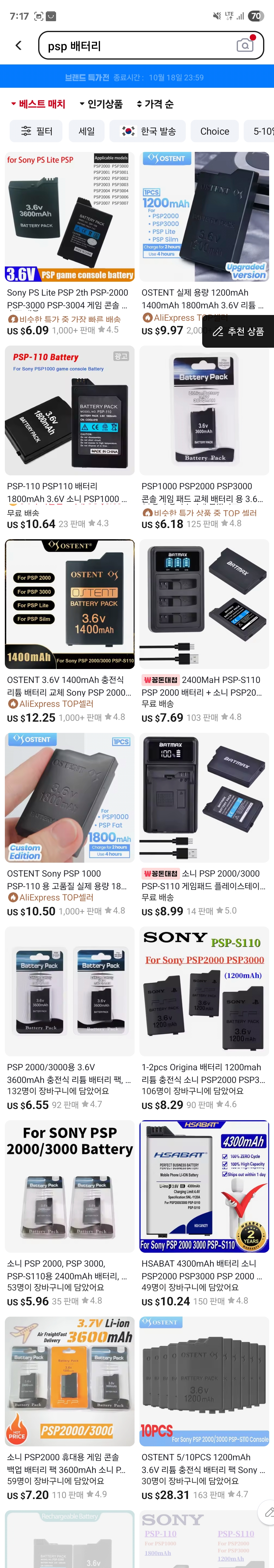 저는 벌써 몇년전에 구매하서 사용중입니다 알리에서 "PSP 배터리" 라고 짧게만 검색하셔도 수십종이 뜬답니다 마음에 드시는거 저렴한거 구매하시면 될듯 합니다 저 역시나 한개한개 구매한거라 어디 특정 판매자 제품을 구매한게 아니랍니다 ^^* 참고로 닉네임 글쓴이 게시글 조회해보시면 스위치등 아이들 콘솔을 직접수리해가며, 관리중이라 직접 사용해본것만 게시글 작성하는 편입니다 요즘 알리제가 십수년전 소니정품과 비교시 심하게 떨어지는편은 아니니 커피값으로 도전해보시는것도 좋을듯 합니다 ^^* | 25.10.16 19:20 | | |
