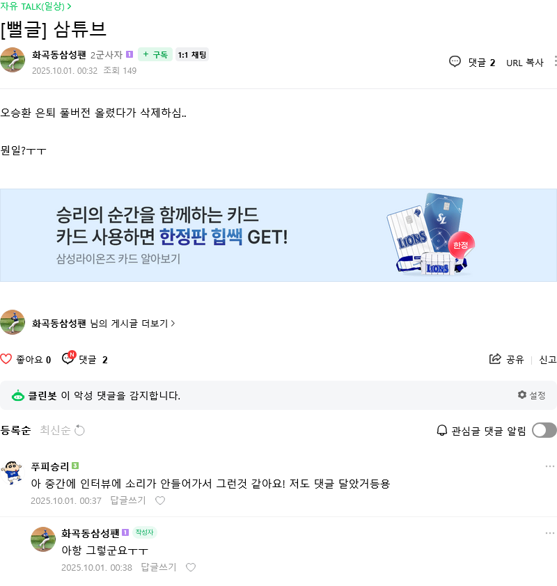 헐?...은퇴식 보고 있었는데 비공개 됐네요;; | 25.10.01 00:41 | | |