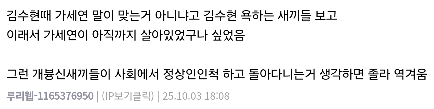 그러니까 그게 변명이든 뭐든 그래서 뭐가 문제일까요? 아직도 이러는거 보면 타진요보는것 같아서 소름끼침 | 25.10.03 22:02 | | |