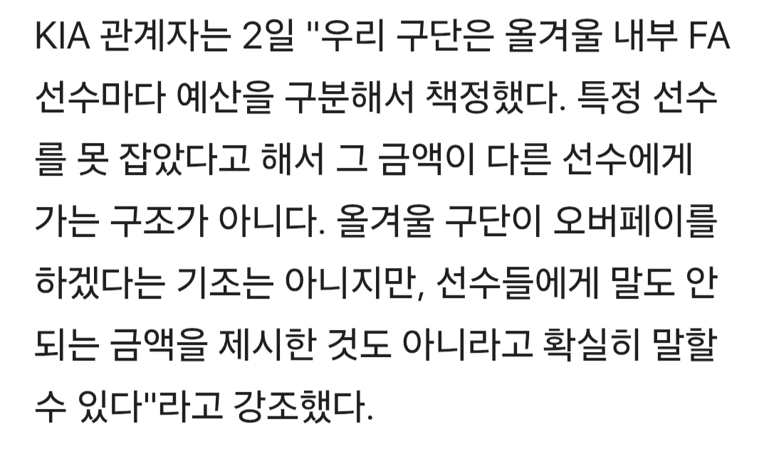 이게 모든 선수단 연봉에 대한 내용이 아니고 내부 FA에 얼마 쓸 것인가에 대한 내용인데 일방적으로 깎고 통보라는 말이 맞는 건 아닌것 같은데요 | 25.12.02 23:38 | |