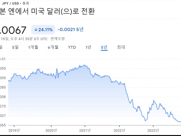 <사진6> 엔-달러로 비교하면 상당하다. (5년전 시점 기준, 달러 대비 엔화가치 -24%)