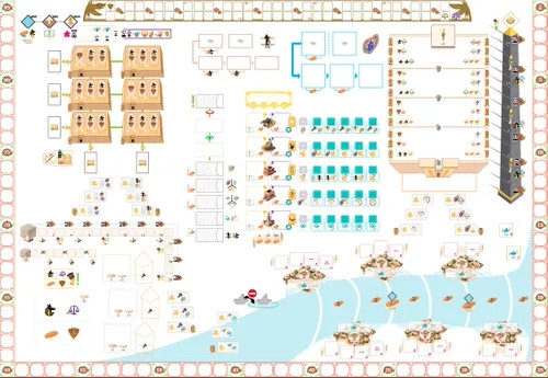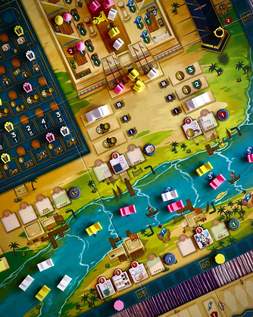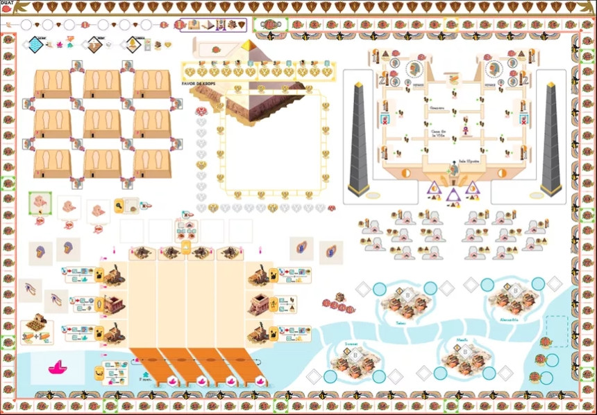 그렇게 쌓인 정보들이 제 머릿속에 하나둘 쌓였고, 저는 조금씩 유로 게임 스타일의 새로운 게임을 구상해 나갔습니다. 플레이어들이 피라미드를 짓고, 스핑크스를 세우고, 귀족을 미라로 만들고, 신전에 공물을 바치고, 나일강을 항해하는... 요컨대 고대 이집트의 핵심을 담은 게임이었습니다.