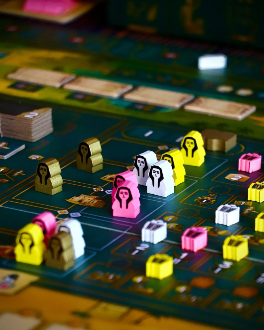 디자인 초기 단계에서 게임은 스핑크스를 짓기 위한 화강암, 피라미드를 짓기 위한 석회암, 미라 제작을 위한 천연 소금과 유사한 나트론, 배를 짓기 위한 목재 등 다양한 자원을 사용했습니다. 자원의 종류가 많으니, 게임에 테마적인 깊이를 줄 수 있었지만 여러 문제가 발생했습니다. 예를 들어 플레이어에게 주어진 행동 수는 제한적인데, 4번의 행동을 거쳐야만 얻을 수 있는 보상이 두 번의 행동으로도 충분히 구현될 수 있다면 과연 그 과정이 꼭 필요할까요?