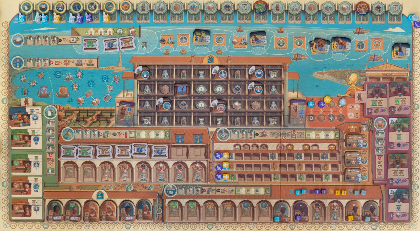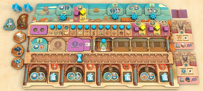알렉산드리아 도서관의 게임 보드는 무세이온을 보여주고 있습니다. 가운데 직사각형이 도서관이고, 그 주변에는 부두와 학당, 기록실, 정원, 아카데미, 왕궁이 배치되어 있습니다. 사서로서의 우리가 시간을 쓰며 특정 행동을 할 장소입니다.