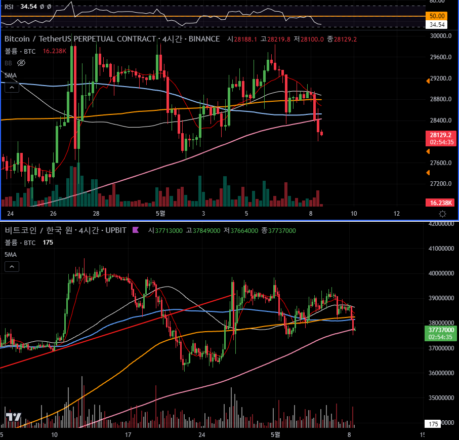 "바이낸스 선물차트"와 "업비트" 차트입니다.