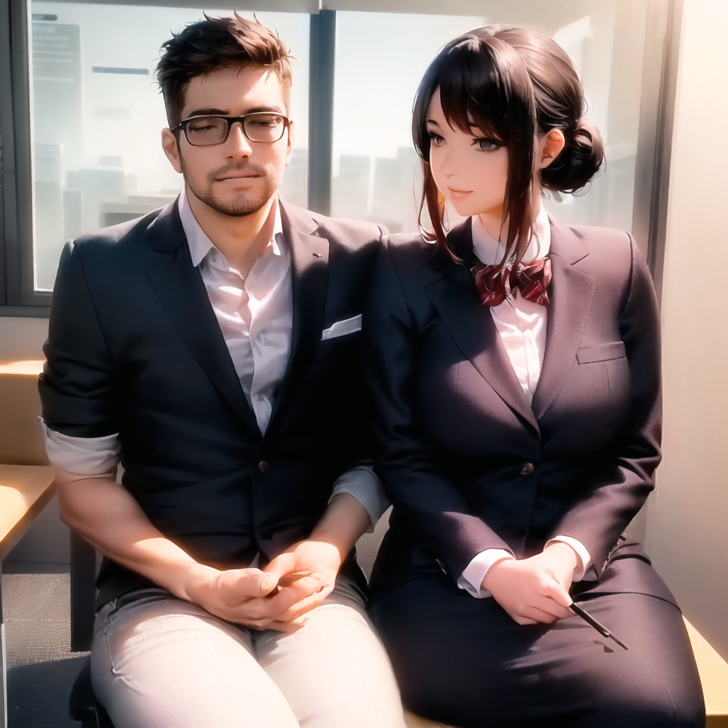 masterpiece:1.4), (best quality:1.3), (ultra-detailed:1.5), (realistic:1.4), (sun light:1.2), (chignon hair, colorful hair color, office uniform), (cute busty girl and a guy couple are sitting together and talking face to face in a break room), full body shot, lovely