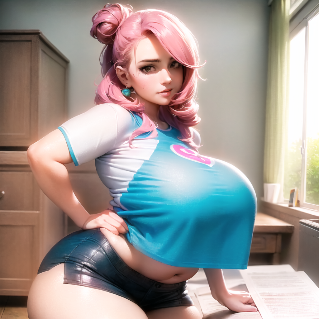 masterpiece:1.4), (best quality:1.3), (ultra-detailed:1.5), (realistic:1.3), (pretty face:1.4), (room light:1.2), (Chignon hair, colorful hair color, colorful crop shirts, micro circle skirt, pink panties, under boob, huge tits, big hip),In the rock paper scissors game, cute busty girl puts out the scissors
